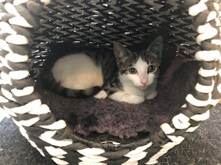 Badger is a 4 month year old kitten. Initially he was quite nervous but in the last few days he has really come out of his shell and he has such a sweet personality. He can be very talkative when you first walk into a room and all he wants to do is to be held and loved. He is currently housed with other kittens his age and they all get along well. He is available for adoption from March 1st 2019.
