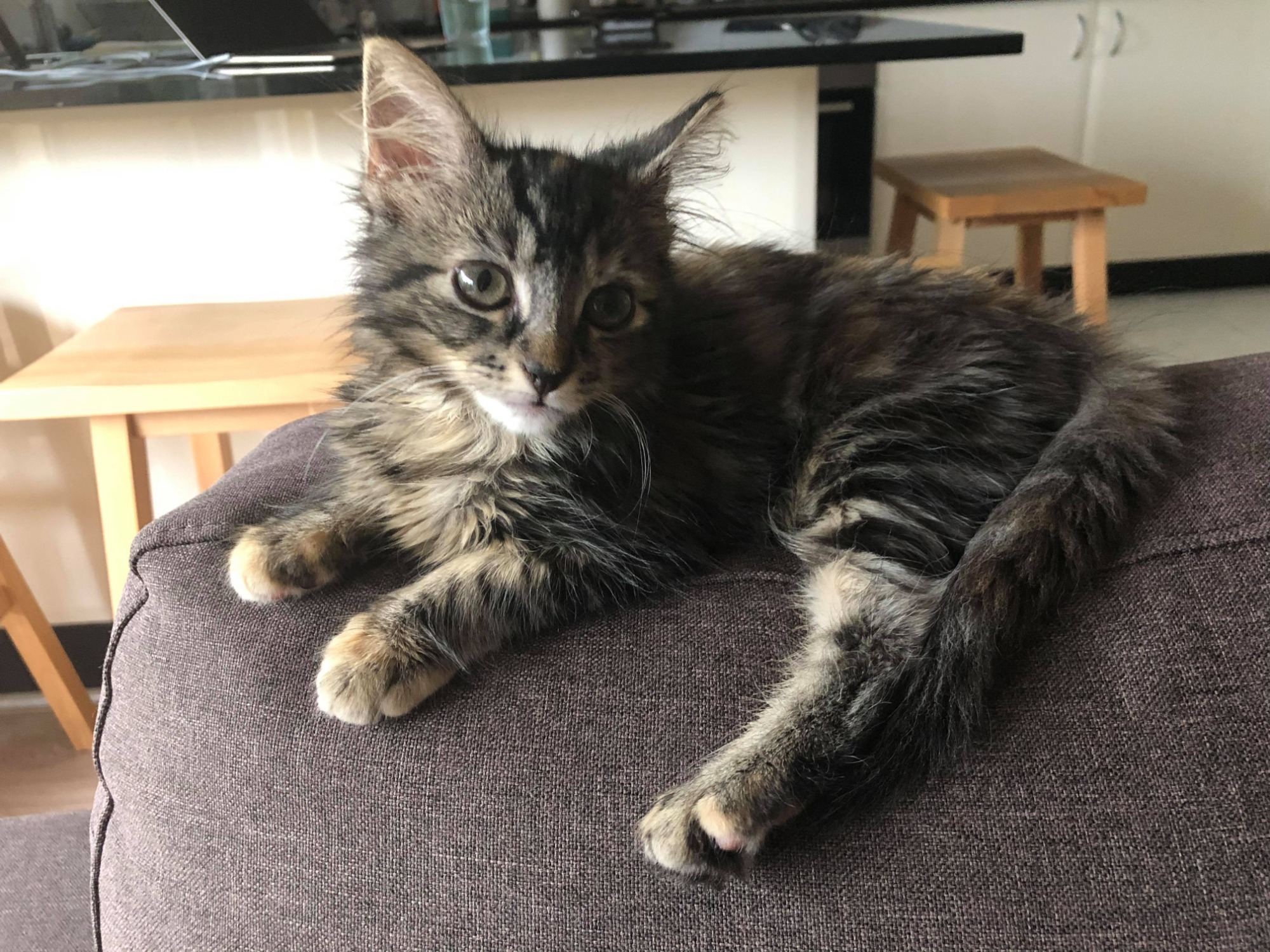 In the mornings I’m always in a good mood and purring, I like when people wake up. I think I will grow to be quite a big cat and my hair is long so I might need you to brush it every now and then. The colour of my coat is a bit of a mix: my legs have stripes like a tiger, my belly is like a leopard and my back looks like I walked under something rusty.