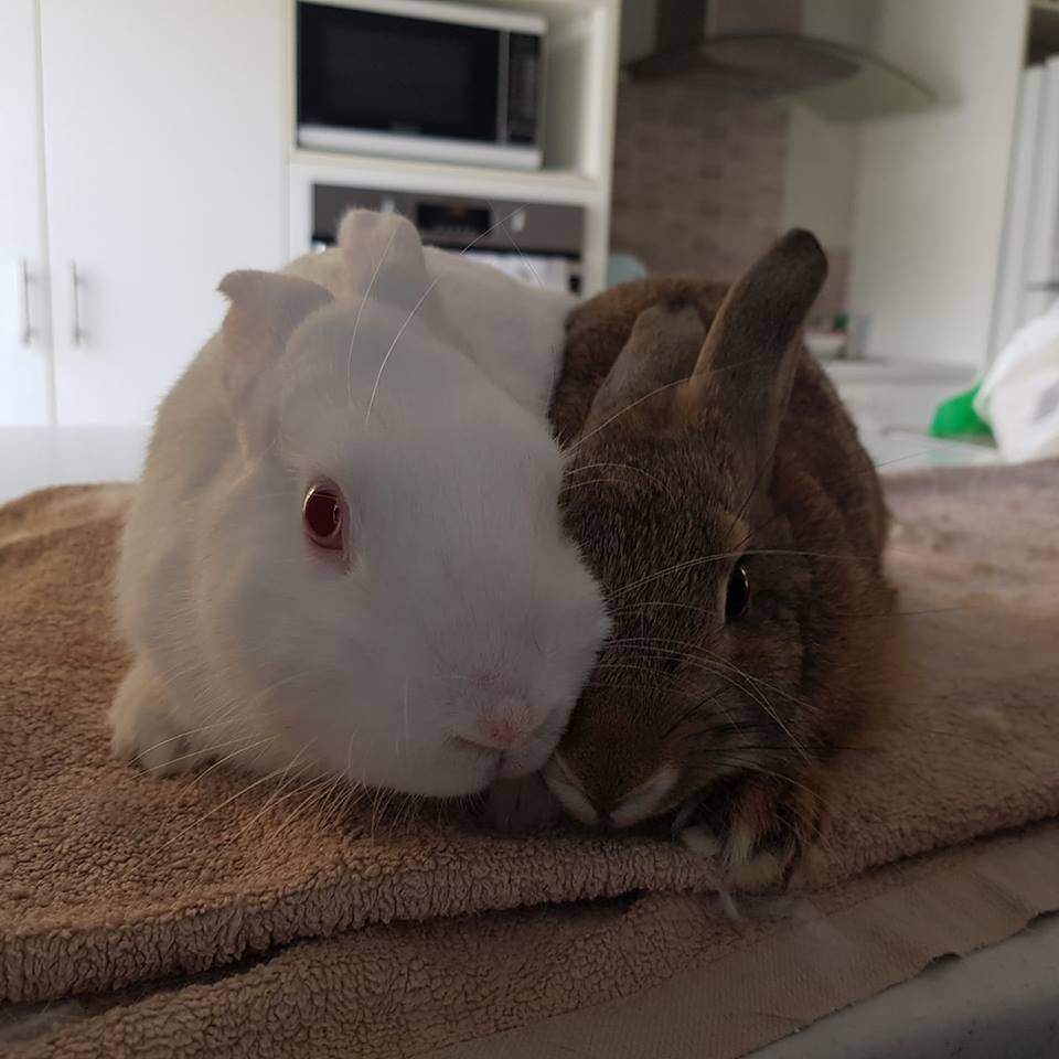 Teeny tiny Bramble is a lovely brown bunny with a fluffy white cottontail and the sweetest face. Mouse is only slightly bigger than little Bramble. He is a stunning ruby eyed white who loves head rubs and has no problem requesting more cuddles from his hoomans. Bramble is shy and she is not keen to be held. Mouse will gladly sit on your lap for snuggles while you watch Netflix and chill together. Bramble and Mouse are a closely bonded pair. They MUST stay together. Have you ever seen bunnies spooning? These two bunnies are #relationshipgoals! Due to Bramble's shy nature a home with no children or children over 12 is preferred. Genuine enquiries only please. Adoption fee includes all vet work. For more information about this adorable duo, send us a message!