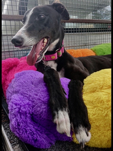 Zoe is an awesome black-and-white girl who is just so happy to be a pet! She only weighs 24kgs, so she’s very small for a greyhound, but she makes up for it with her huge enthusiasm for…well, everything! Zoe loves her walks, loves her food, and really loves her three canine foster siblings. Zoe needs a home with another dog to share her playfulness, preferably for hours at a time!