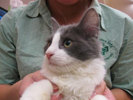 This is our lovely vienna! she is a domestic medium hair kitten. She is white with grey – blue markings. She was bought into the stud park vet with her 2 brothers and 2 sisters as they were found as strays. She loves playing with her siblings very much and also loves playing with any toy she can get her paws on! at bedtime she is happy to snuggle with her siblings and the staff. She has a very placid and tolerant nature so would suit a multi pet home or a home with children!
