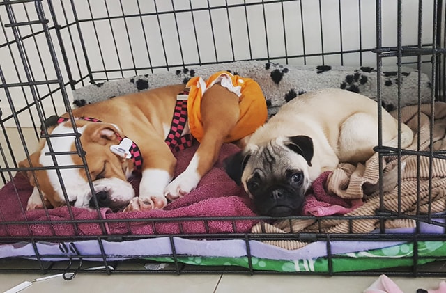Bun is an absolute social butterfly, and adores her friends. She is gentle with tiny puppies once she calms herself, and loves a rough and tumble with more energetic dogs. She certainly doesn’t let her disability slow her down, and can get a lot of speed up when ‘running around’ playing. As she has no real use of her back legs, she needs to only be allowed to play on smooth or soft surfaes. She slides around on the tiles like a speed racer, and can get a lot of speed up on the grass as well. She must not be allowed to run around on concrete or rough surfaces, as she will scrape her skin off. Her incontinence means she needs to wear nappies when indoors, and this gives her more assistance to slide around with ease. Bunny has a nappy routine, and is so used to her routine that she makes it easy for her carer to manage.
