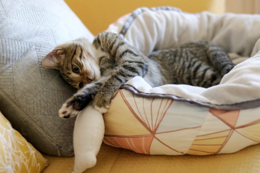 I adapted in just a few hours at my foster home, I was found cozied-up on the couch watching telly, ehem **my couch**. I quickly found the litter box, the cat food, and my new fur-friends!