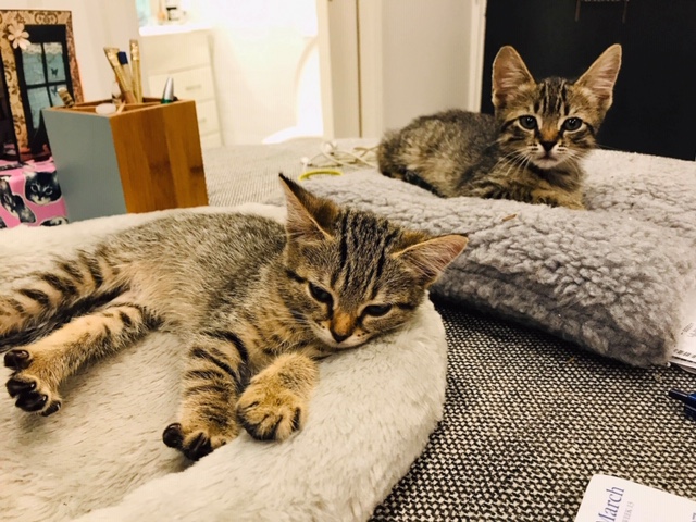 Lily, is a female domestic shorthair tabby, the paler colour of the two. She is extremely affectionate and purrs like a motor as soon as you touch her. She will snuggle in your lap and loves cuddles. Buster is slightly shyer than his sister at first, but within about half an hour of knowing you he is your best friend.They are full of beans and adore their foster kitty siblings, and they love playing and charging around the house with them. They also have access to a fully enclosed mesh play area in the courtyard, so they enjoy the sunshine and outdoor play.