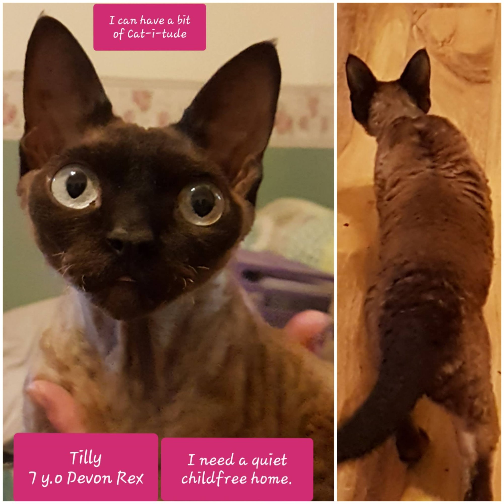 Tilly has a bit of Cat-I-Tude so needs a confident cat owner. Don't get us wrong this girl is affectionate but does not like to be forced to do things she doesn't want to....after all she is a purebred Devon Rex Cat.