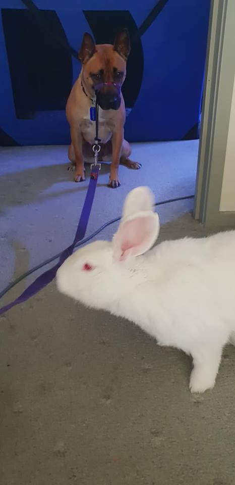 I have two feline foster siblings which don't phase me at all, so if I go to a home with a cat that will be fine. I also have 2 rabbits living with me currently. At the moment my foster parents are teaching me to leave them alone. When the bunnies are roaming free, Dad has me on lead as I cant be trusted just yet, and for this reason it would be best that I go to a home with no rabbits or other pocket pets. I can be off lead with them when they are safely in their enclosure and I am pretty relaxed when in the same room. It’s mayhem here with all my furry friends but I like it.