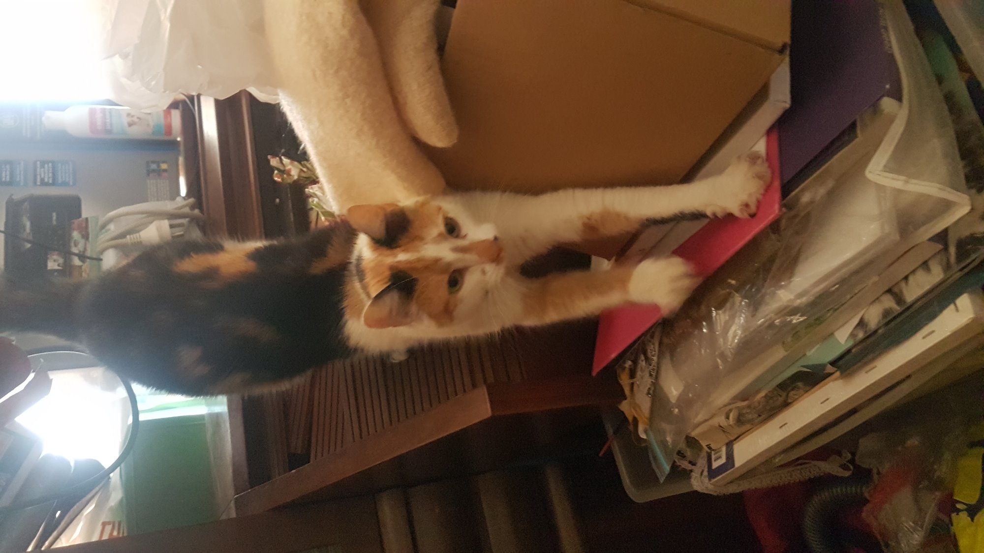 Callie loves to play , explore ,but most of all loves to rub around your legs , smooch you and show you lots of love. Callie is not used to other cats so would be better in a single cat household, but with a slow introduction we think she would be ok .