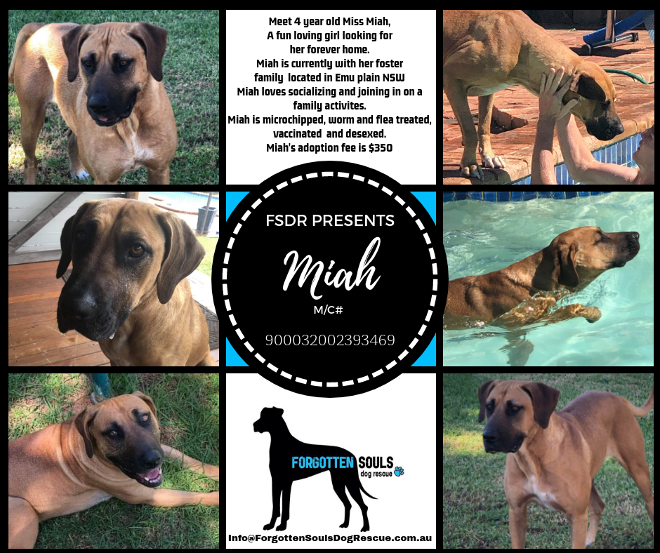Miah embarked on her adventure with Forgotten Souls Dog Rescue with a road trip from Wagga dog pound.