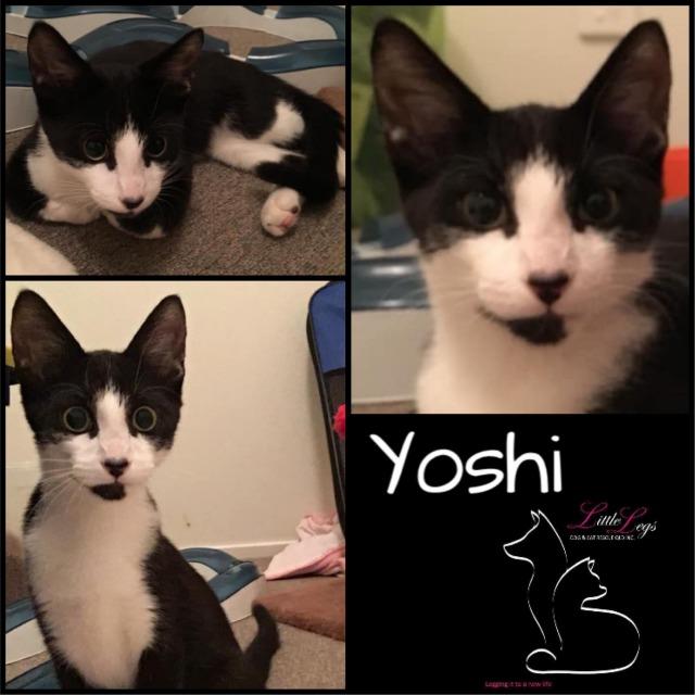 Yoshi came to Little Legs as a stray. He is a smoochie boy, who loves pats. Yoshi has adapted to life in care very well. He loves his food and enjoying being pampered and cared for instead of fending for himself on the streets. Yoshi loves to snuggle and play with his brother. He has also started making friends with his older kitty foster siblings.