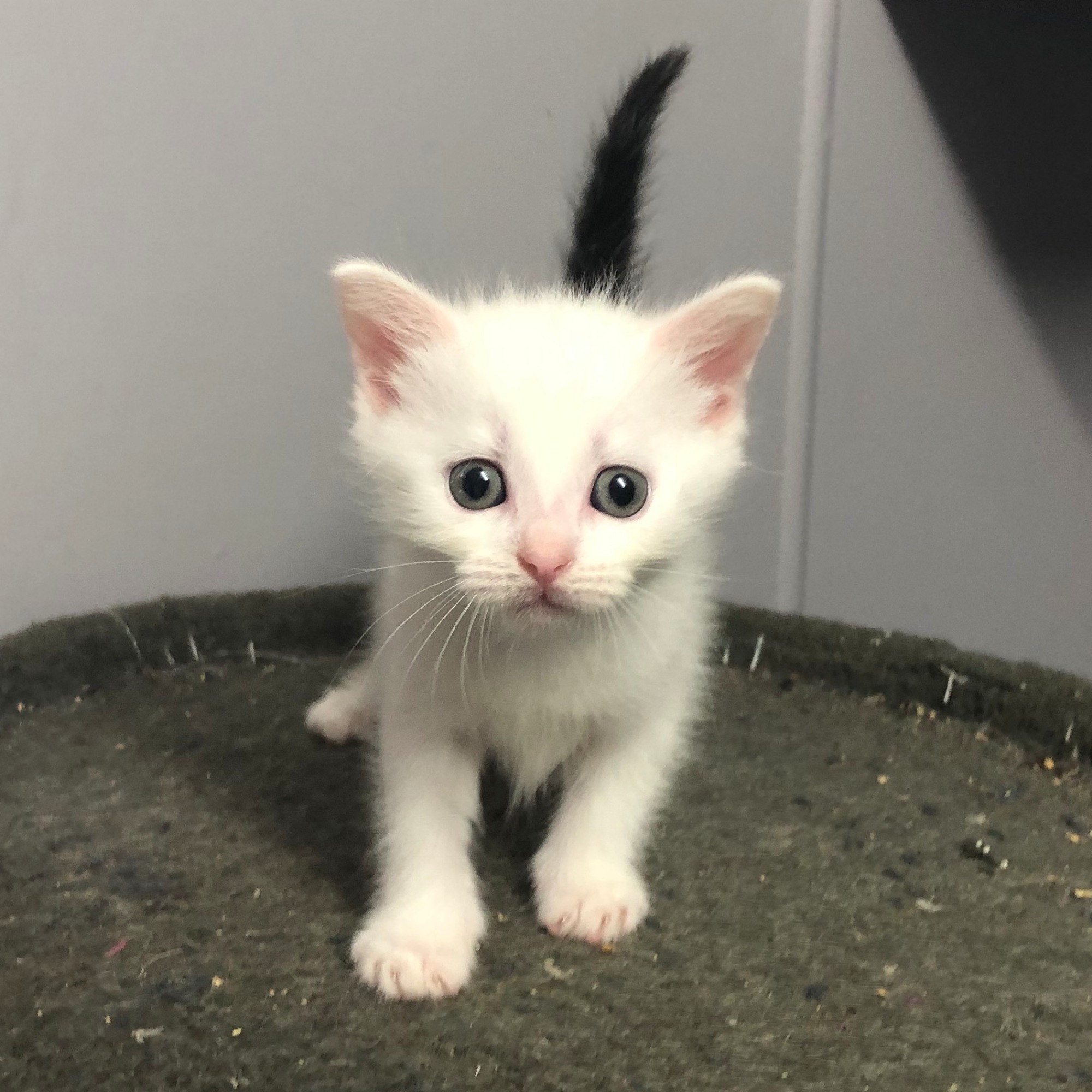 I am a healthy, happy and friendly young kitten who is looking for a forever home. I am a stunning young lady. I am predominately white with a cool black spot on my belly and black tail.