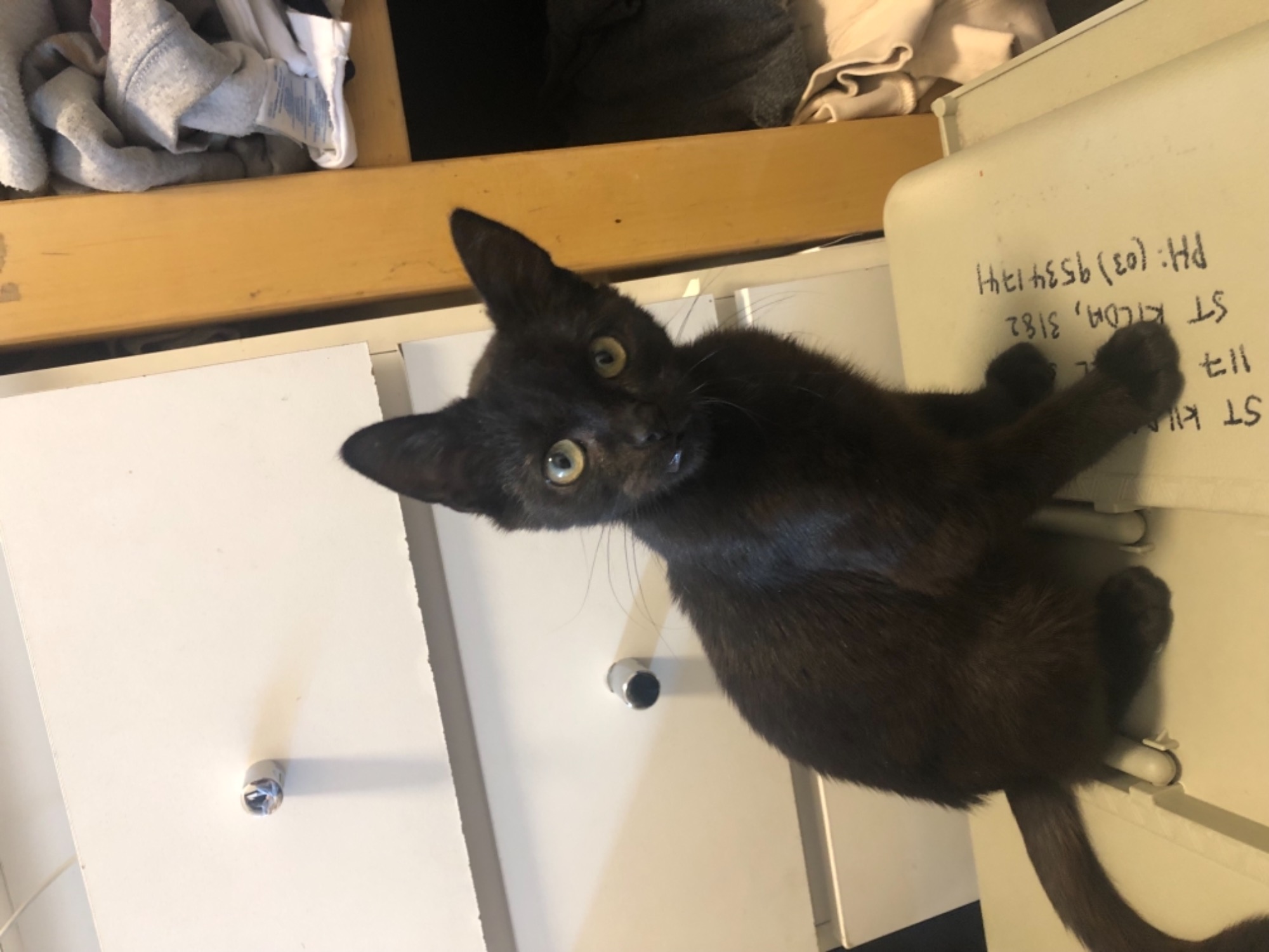 He has been vet checked and has a chronic head tilt. He doesn’t require any long term medication and is a healthy kitten that’s just sometimes a little clumsier than others.