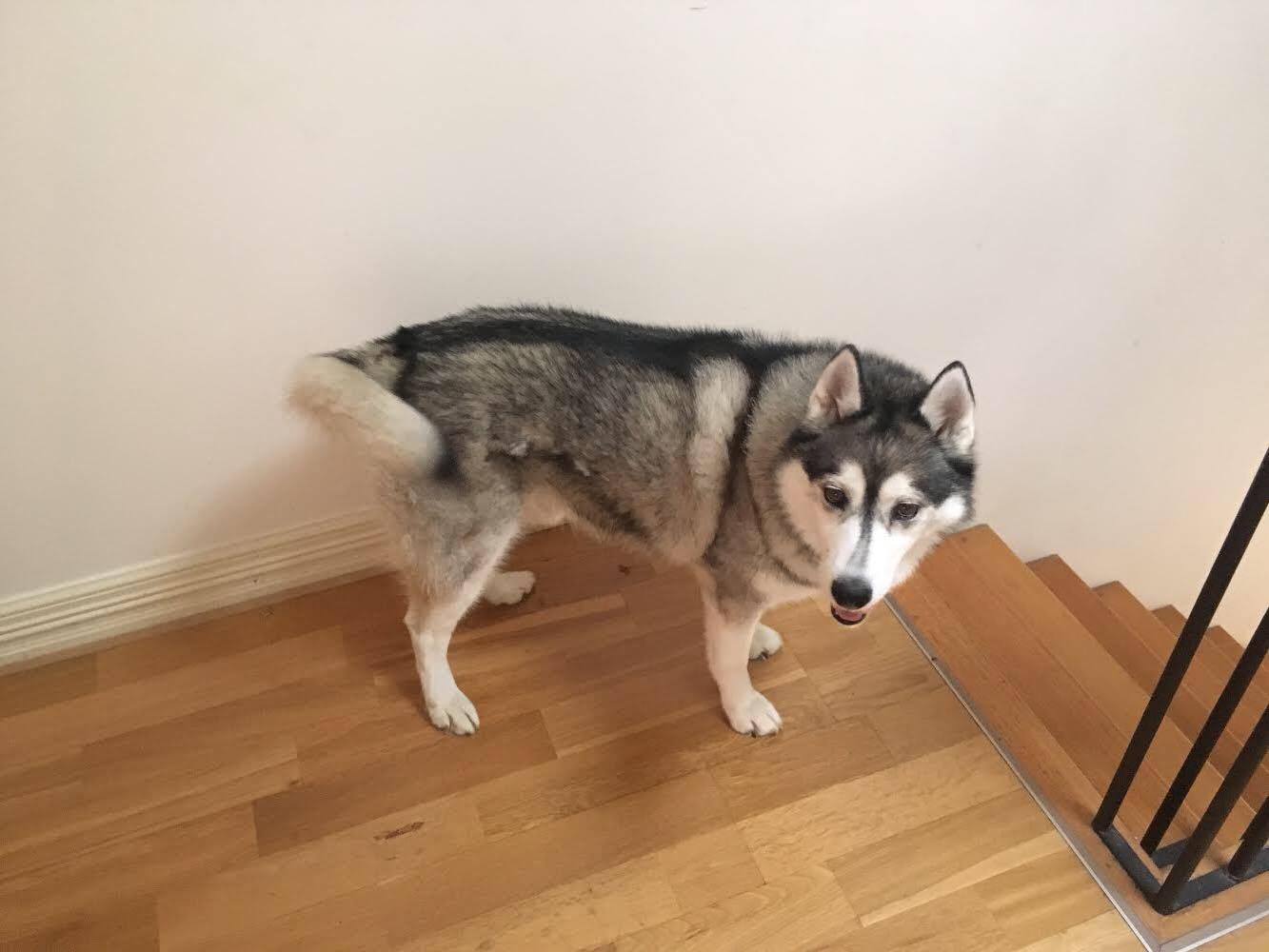 Monty thinks cats are great fun to chase, so the usual husky rules apply with a secure, 6ft husky-proof fence and no cats or pocket pets. We’d prefer a household with no kids as he’s very much about the quiet life these days.