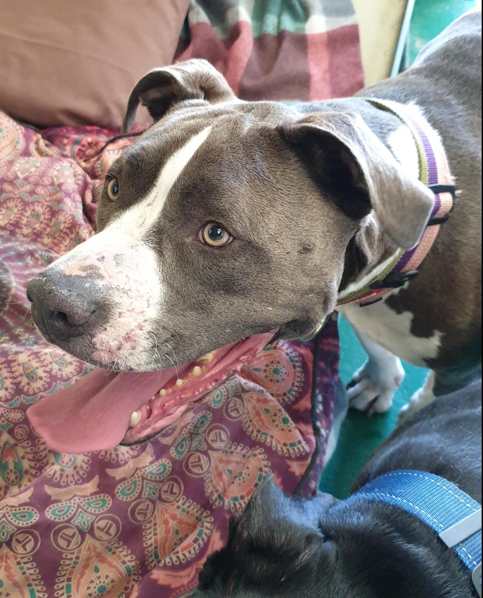 Polly is a large American Staffy who is mostly calm, quiet and gentle. She has lived with Winston her mate since young and may struggle without him, however as she is quite dominant and is best suited as a single dog (unless rehomed with Winston). She has had minor experience with children but has not lived with them and is not suited to cats. Polly has a quiet energy about her and is good to handle. However, she does radiate intense vibes when meeting dogs on lead and may need some firm management. Polly is house trained and use to to sleeping indoors.