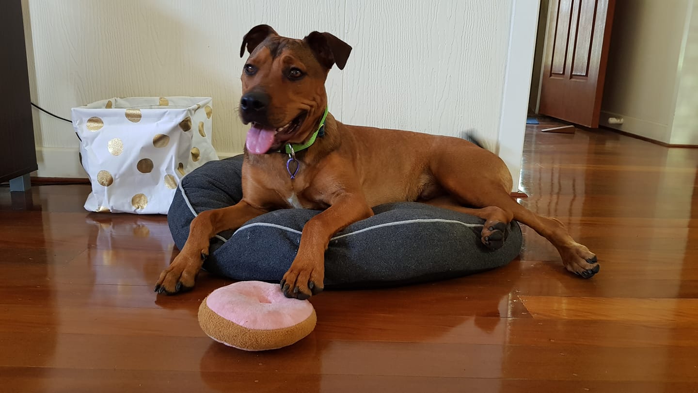 He loves a walk (or jog, if you're brave), and will do anything for a treat. He's great in the car. He loves cuddles, and the lounge, so would love to be allowed indoors, but will make do with outdoor furniture if indoors isn't an option.