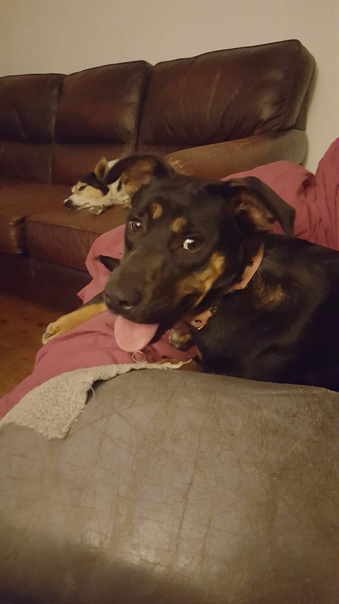 Has met kids and loved them she will make a really good family member. We think she is kelpie a staffy.