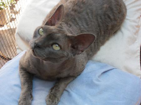 we cannot understand why this lovely rex boy and his brother brock have had to wait so long to find a forever home together. We try to make them as warm and comfortable as possible in our cattery on these chilly nights but these lover-boys deserve to be living in a real home with a loving family who appreciates their very special qualities. There's nothing that both of them love more than to sit on your lap and wrap their long "arms" around your neck while gently purring in your ear. **