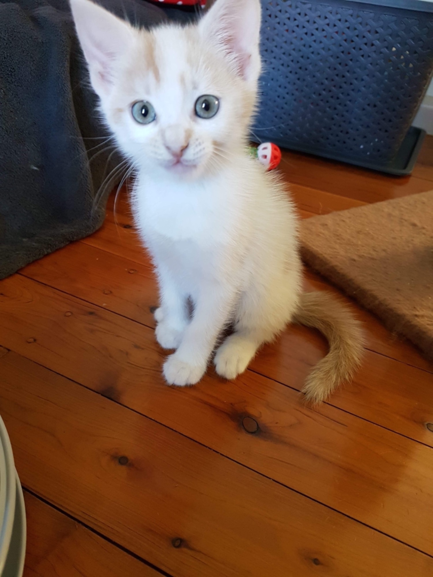 This stunning little kitty is white with some beautiful ginger markings😻