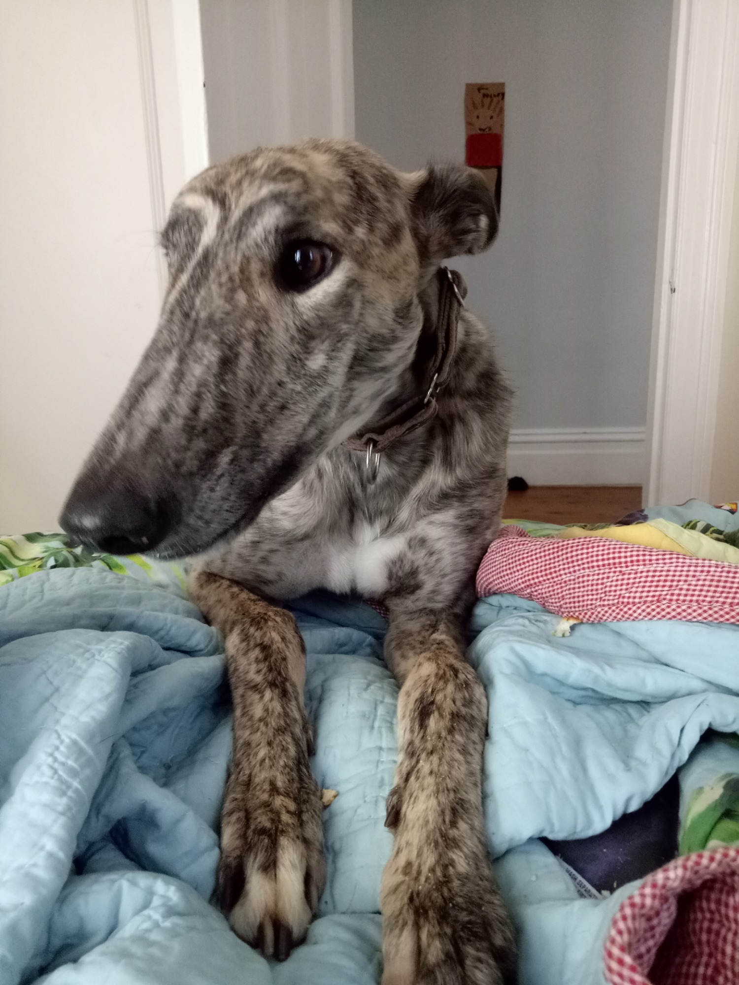 Nev has decided he quite likes pet life and is great with other dogs, cats, rabbits and his small people. This guy is one of the most stunning looking greyhound we have come across and his personality mirrors this perfectly.