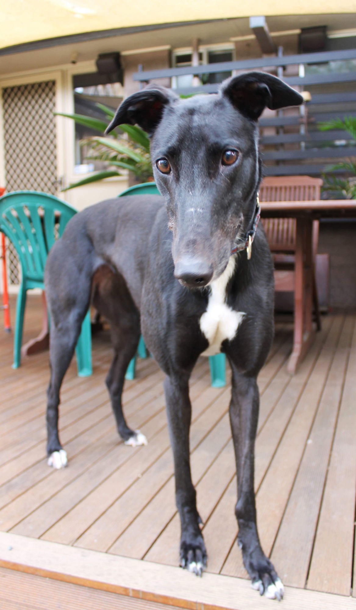 Eve is an amazingly sweet, affectionate and happy 5 year old girl. She thrives on companionship with humans and her greyhound foster sister. She is very self-assured, interactive and confident. Rarely, have we seen a greyhound adapt to home life so quickly. She is just lovely!