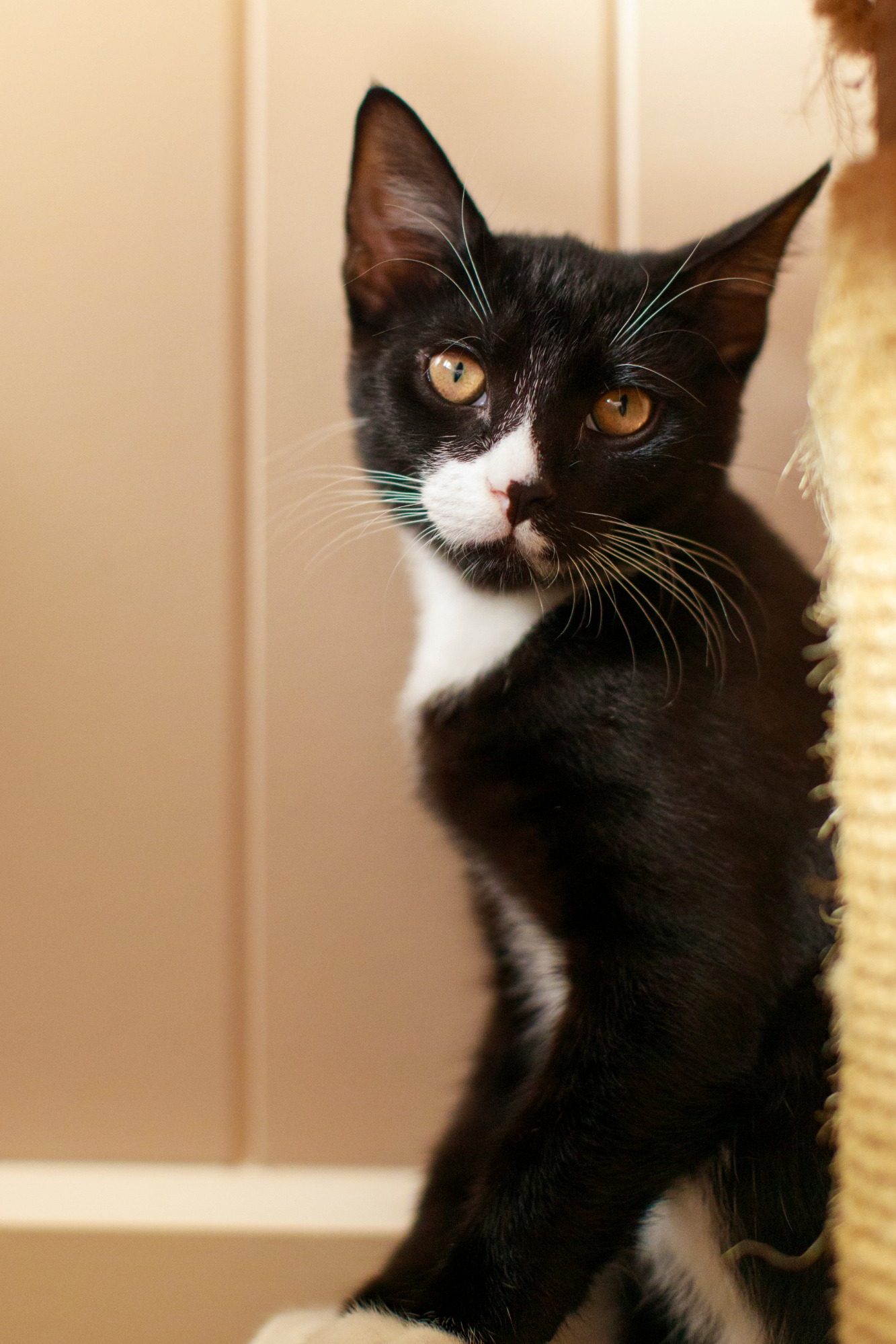 Toby is a gorgeous boy whose markings are striking and resemble a tuxedo, just like James Bond. He is a little shy and is working hard on trusting the human kind again, so he sometimes prefers to watch at a distance until he feels safe to come close. Toby is the only boy amongst three sisters, so he is super patient. The cat tower and tunnel is his favourite place and he enjoys the various toys, joining in many fun games with his sisters.