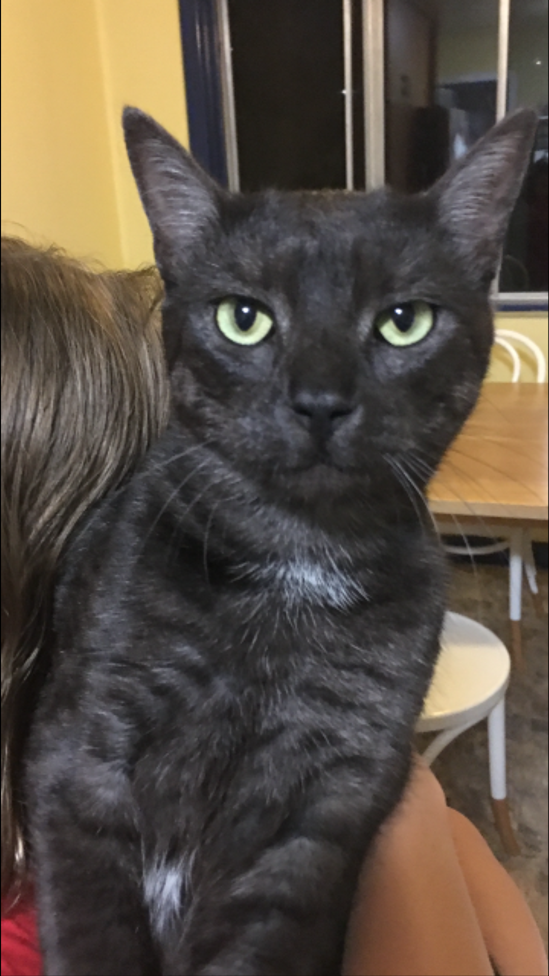 I'm a handsome cat, mostly black with unique markings on my chest and tummy.