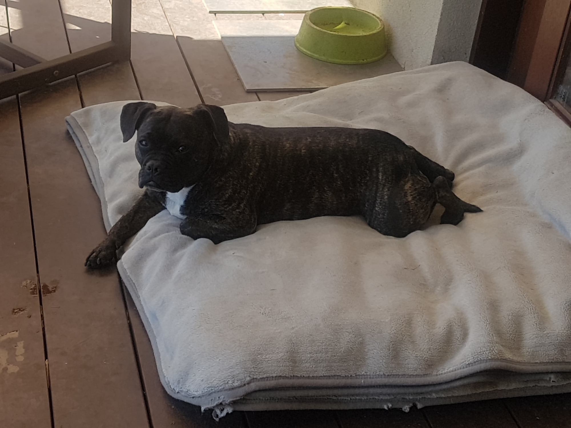 Lulu currently lives with a 46kg boxer and they get on great, she could be rehomed with another dog (which would be good) as long as they were easy going. She loves rough and tumble play so a larger or stronger breed would be recommended. She could be rehomed on her own but not if she is to be left alone all day.
