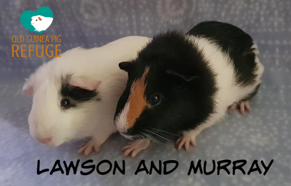 Lawson (white with patches) and Murray are 2.5 month old brothers who love to do zoomies and popcorn around the cage and when they get hay. They also looove their veggies.