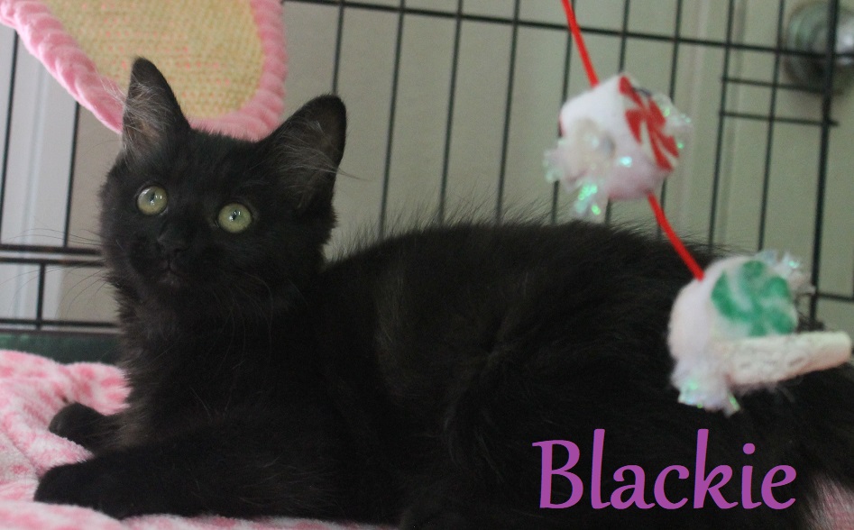 Blackie is a kitten ball of crazy fun! Her and her brother Dekker are double trouble that's for sure! Blackie is the ring leader in their mischief and is often found trashing her cage and having a ball doing it! She is a very affectionate little girl and would make an amazing companion full of laughs and cuddles for her new family.