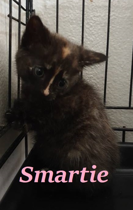 Smartie was found on the side of the road with her siblings, filthy, wet and covered in fleas. After a nice warm bath and flea treatment we discovered four very cute and cuddly little kittens. They took a few days to warm up to people but haven't looked back since, exploring and playing like healthy normal kittens.t