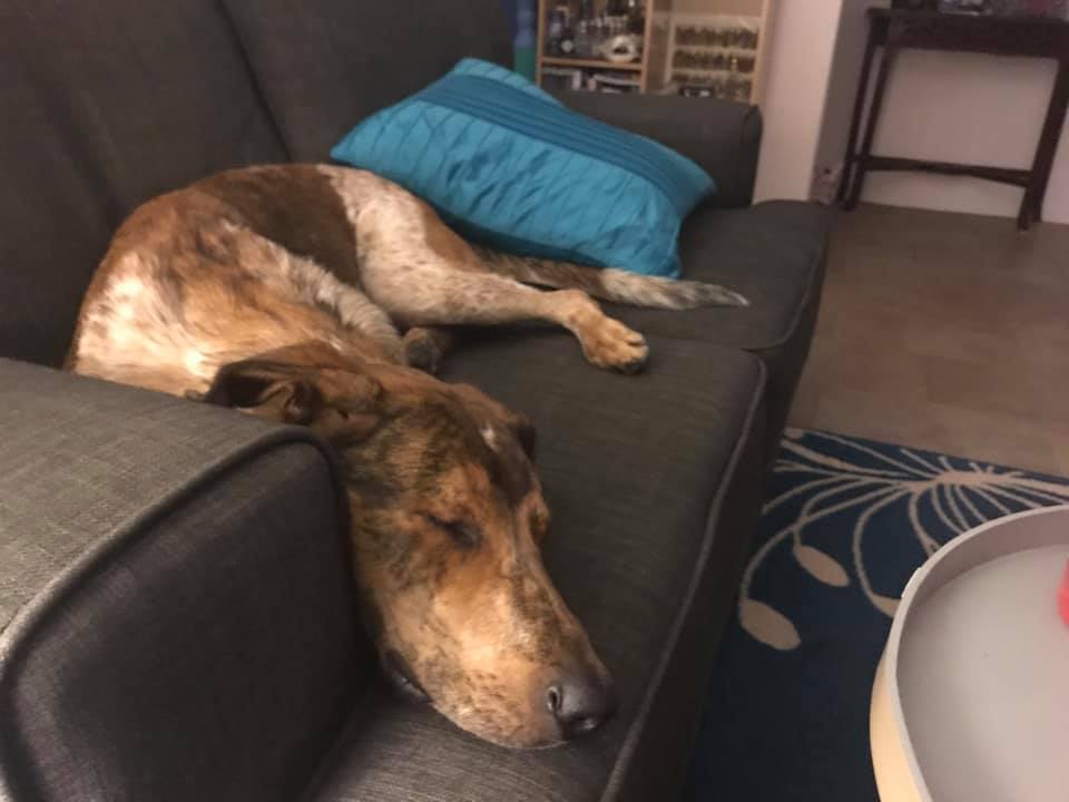 He especially loves going for his twice daily walk/run on the bush trails. After his morning adventure, he’ll happily spend the day outside chewing on a juicy bone. At night, he sleeps on his bed in front of the TV.