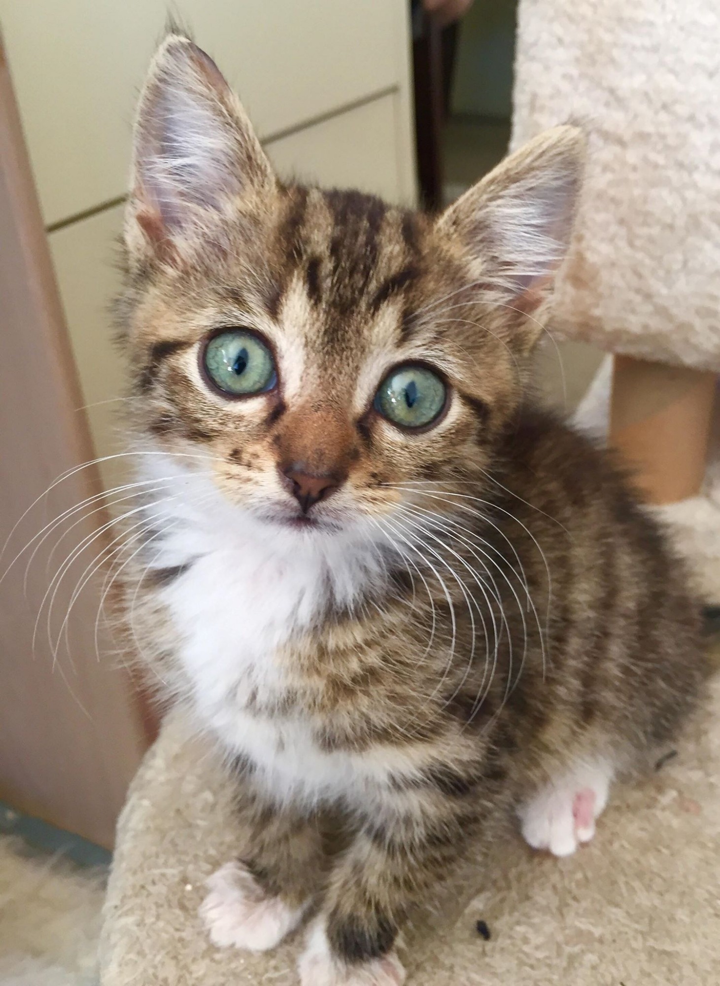 Hi I'm Bertie and I am a sensational tabby boy. I am one determined little kitten who loves nothing better than chilling with my sister Wanda (also up for adoption) or focusing on one specific toy in order to master it! I have the most expressive face (at least that's what they tell me) and I do love a cuddle as it makes me purr really loud