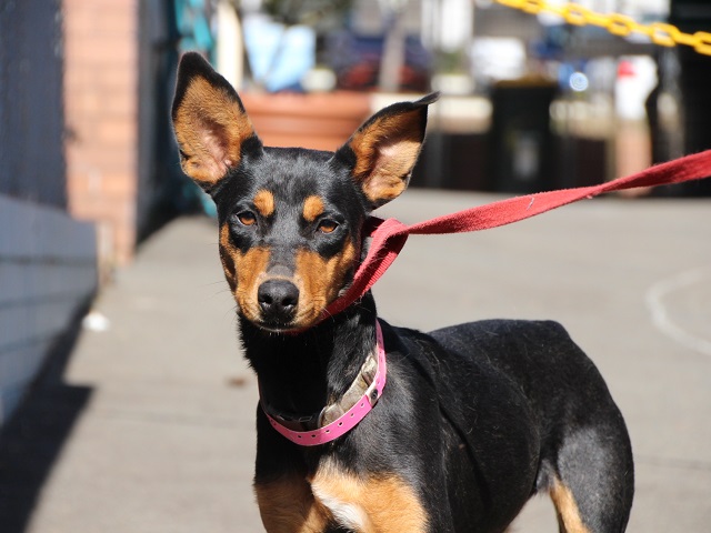 Sandy is a beautiful girl who enjoys playing with other dogs. She knows how to sit (especially when treats are involved) and would suit a home where she will get basic obedience training. She is hoping to be adopted to a home with another outgoing, playful dog as she enjoys dog company. She looks like a kelpie x doberman and she's about 18 months old.