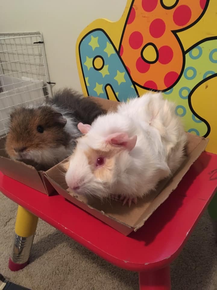 Because of Cricket’s crazy hair, an indoor home is preferred as he will need grooming to keep his mane tangle free. Rocket is a ninja pig and loves climbing and racing around. Cricket is a zooming pig. They both know when breakfast is and will alert you of this and also for their bedtime snack - oxbow treat.