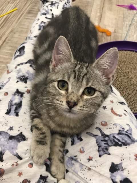 Female, silver tabby. Very pretty but it has not gone to her head. She is easy going and was the quickest to socialise/adjust and appreciate a cuddle and loves a lap. She is the most relaxed and friendly of the trio unless you happen to be any feathered toy, in which case you will be dragged off to her lair. She is the smallest of her siblings but wins the daily tug of war for the flamingo wand toy every time.