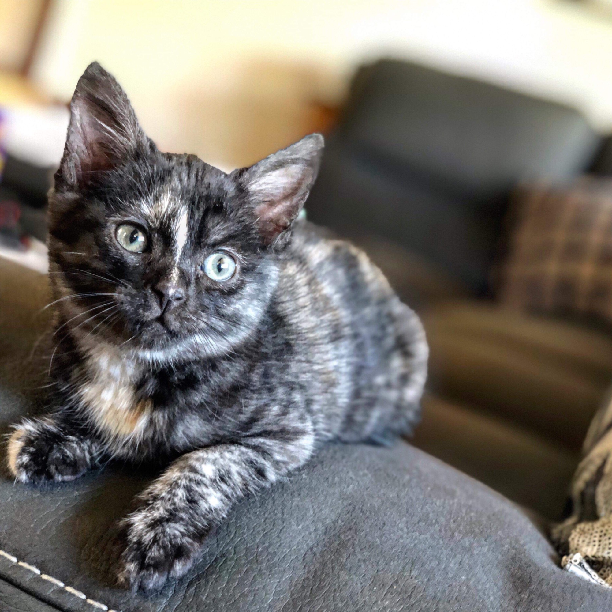 After a rough start this striking and unusually coloured tortie girl has decided that she quite likes having a family to play and snuggle with 💛