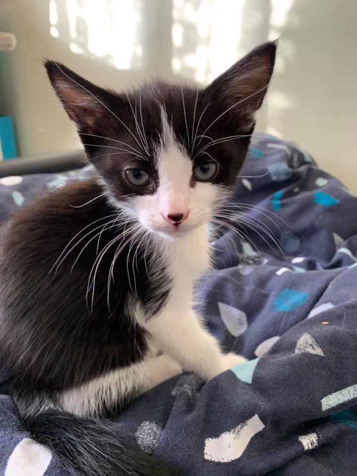 He is a rescued fluffy kitten approximately 8 weeks and is available for adoption. Archie is a black and white short haired little ball of fluff and fun.