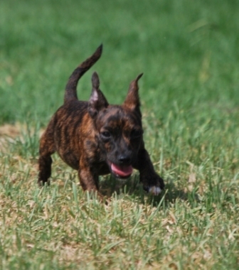 this dear little fox terrier blend puppy is only 14 weeks old. She loves to play with her siblings, interacts well with people and also enjoys playing on her own. Cuddles are tops with gypsy as she snuggles into your lap to have a cuddle and a snooze. This brindle bundle is full of personality!