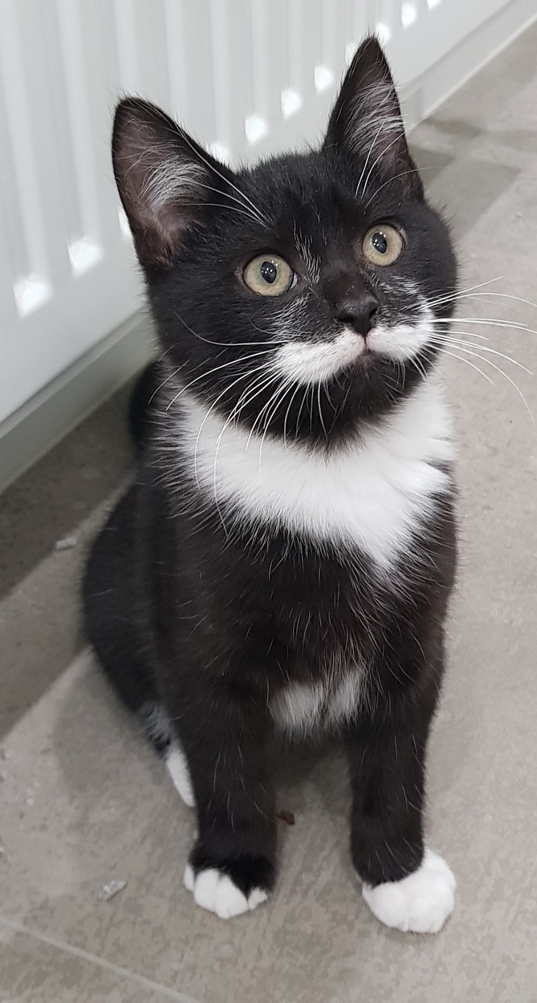 Mario is the bravest of the three kittens, and gets the most comments with his perfect moustache. He has a huge appetite and purrs with anticipation when he sees you coming with food. He loves a pat and back scratch, and purrs loudly for any pat givers. Having started life on the streets, Mario had to learn what toys are for; once he learnt that feather wands existed there was no stopping him! He also loves to play wrestle with his siblings-maybe you’d like to take two kittens home? He is much more comfortable in a home environment, and thrived in foster care. Amongst the hustle and bustle of the clinic he is more reserved and shy when meeting new people, but we have no doubt once he gets a home and a family of his own he will become a wonderful, loving pet.