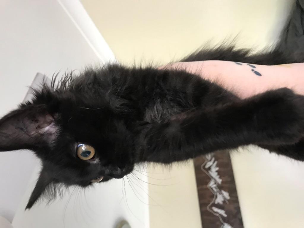 I am a black smoke kitten and my whole belly is a really light grey colour, and I will show you this as I do like a good belly scratch. I have the loudest purr that I am not shy to show off. It sounds like a jet engine starting up, and once it has been turned on it takes a while to shut down.