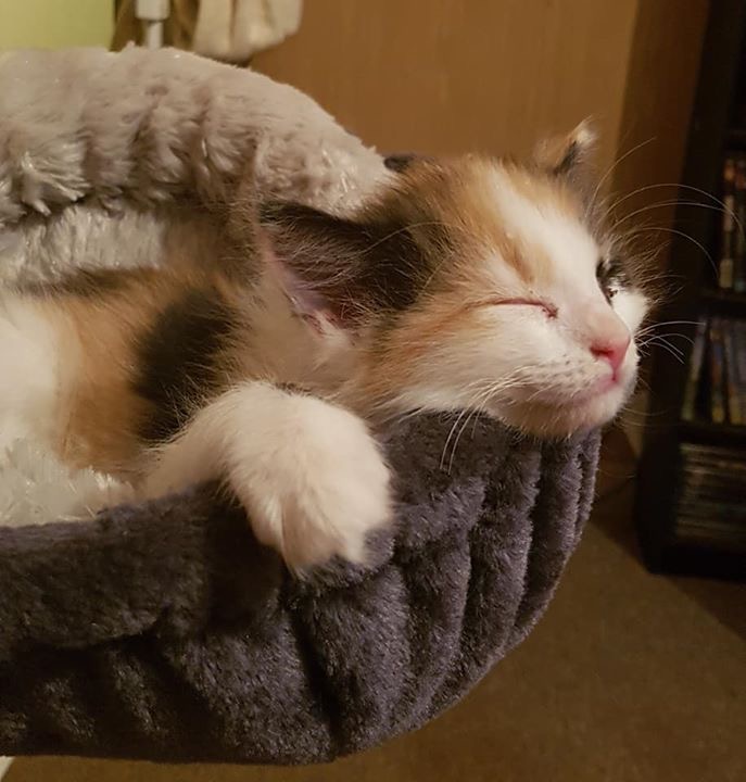 This gorgeous little calico torti girl likes to be included in what’s going on! She loves to sit on her carers shoulder checking out whats on facebook! She’s a curious kitten with much love to give and will make a wonderful pet for a lucky family !
