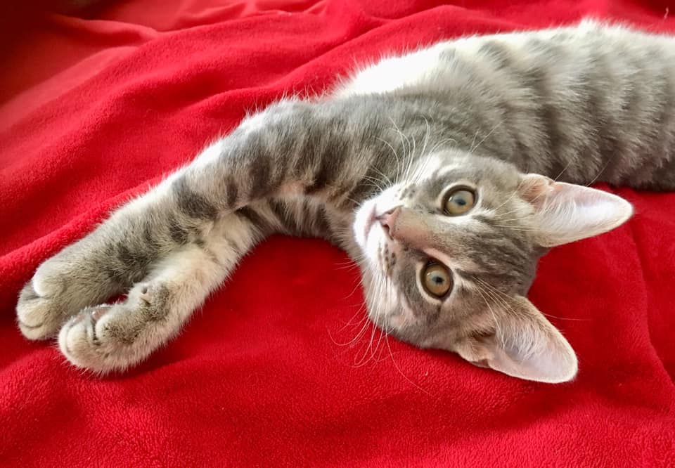Hi all! I'm Stripes. I'm a playful, friendly and cuddly kitten who'd make a lovely furry addition to any household. I love purring and smooching and once I start, I don't stop! I'm crazy about human food and when you're eating your dinner I try and steal some! I love to curl up on your lap when I'm tired. I'm good with kids and will happily play with them and then curl up for a little nap. Tissues are my favourite thing to play with.cat