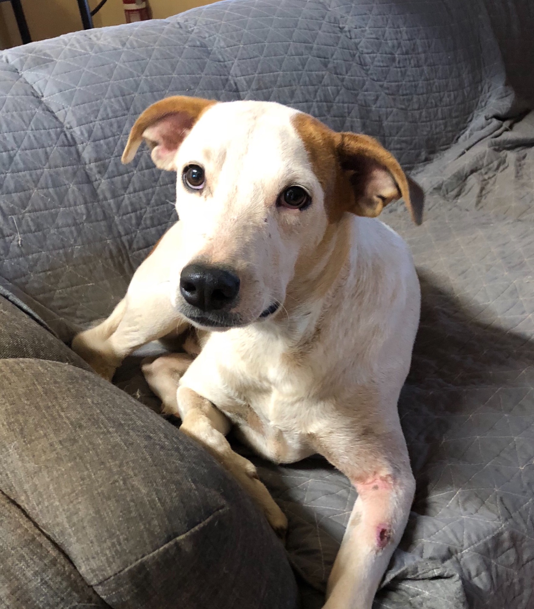 Spot came to us from an indigenous family with his 9 litter mates when he was a tiny puppy. Mum Pepper was hit by a car and injured when they were only a couple of weeks old. Pepper was not able to feed and care for them, so their indigenous family asked us to raise the pups up for them. They had been without mum for a couple of days when they came into care. Some of the pups were frailer and needed more care, but Spot thrived from an early age and was one of the group that returned to their family. Mum had surgery and recovered well too and went back home too. We have posted a picture of his mum and dad, who are both stunning dogs. Spot came back to us because he had an accident and have to have surgery on his leg - his family were happy for us to pay for the vet care he needed and then rehome him.