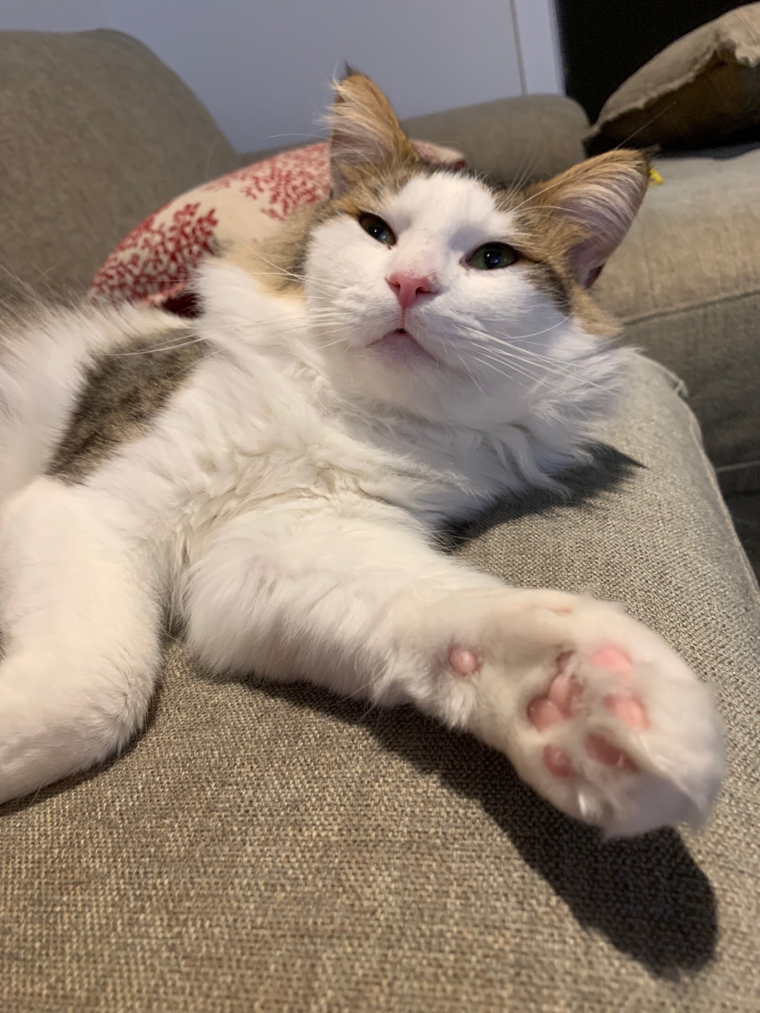 I’m happy as an indoor cat, which suits my pale complexion and pink nose – I don’t want to ruin my Beckham looks with cancer! I’d also be happy sharing my new home with other young felines. If you are still in any doubt that I am the purrfect cat for you, consider this: I’m good-looking, young and playful – just like those silly kittens everyone wants. UNLIKE those pesky young things though, I am toilet-trained and like curling up with my people for long naps on the couch! So, what are you waiting for?! Be my purrfect match – I am waiting fur your contact!