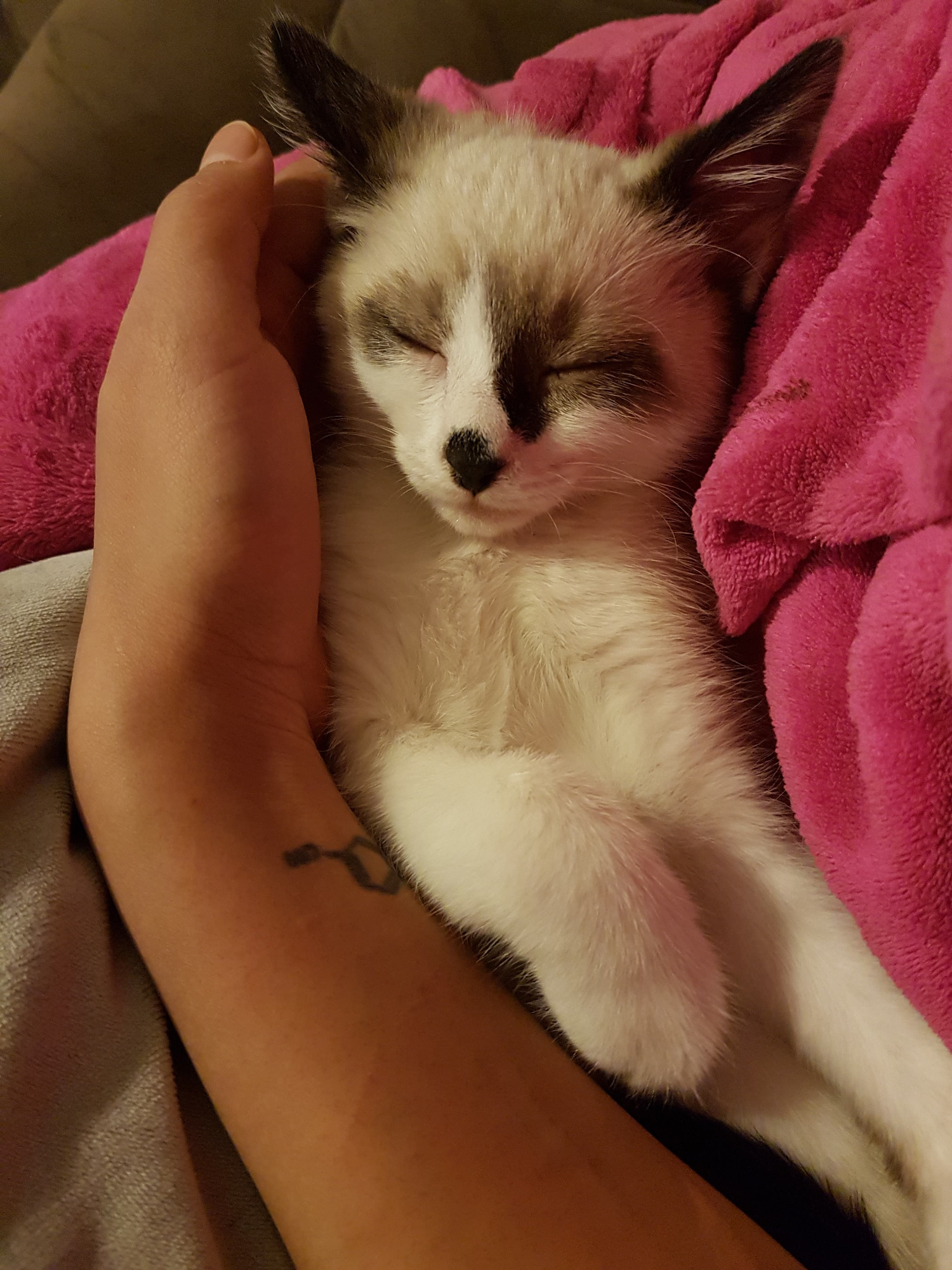 I have grown up with kittens my age and mature cats. I get along with both, love playing with both and playing with my humans, I find it really funny when they act like a cat with me. My favourite game to play is tag, especially since I’m the fastest little zoomer out there! Once I’ve had my fun I will come looking for my friends to have a little snooze with, I really like cuddles under blankets with gentle pats.