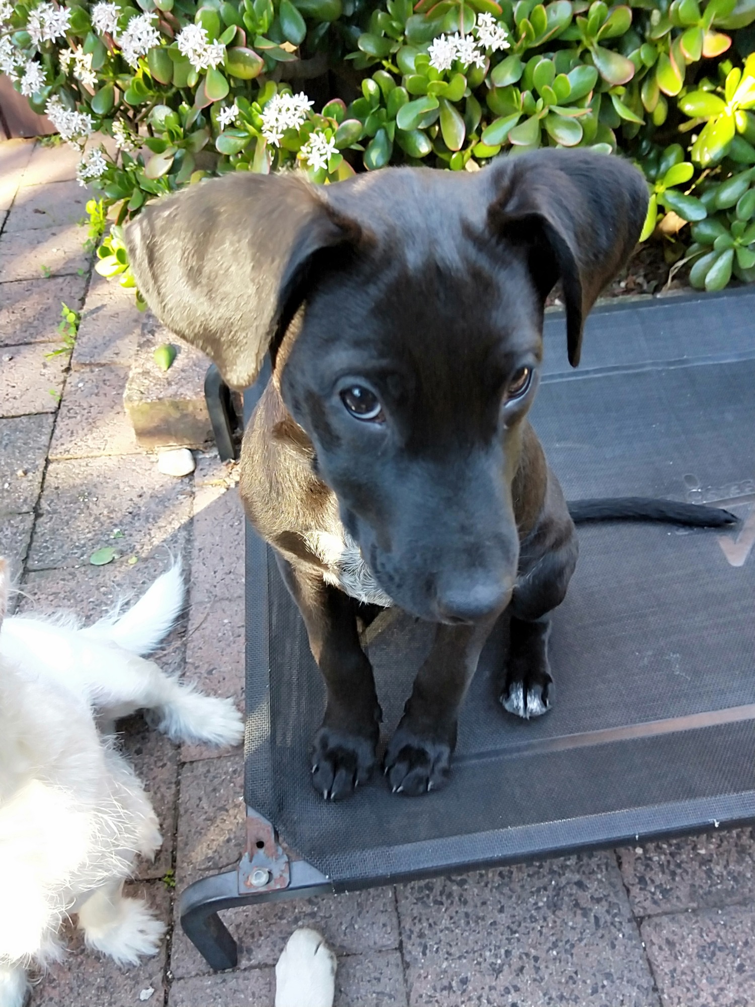 Denzel gets along with dogs of all sizes, children and confident cats. He can be a bit in your face when playing and has been learning to sit and not jump, but in his excitement he can forget. Commitment to puppy school and further obedience training is a must to help shape him into a beautiful adult. We are expecting him to grow into a lean medium to large sized dog, his cross breeds are an educated guess.