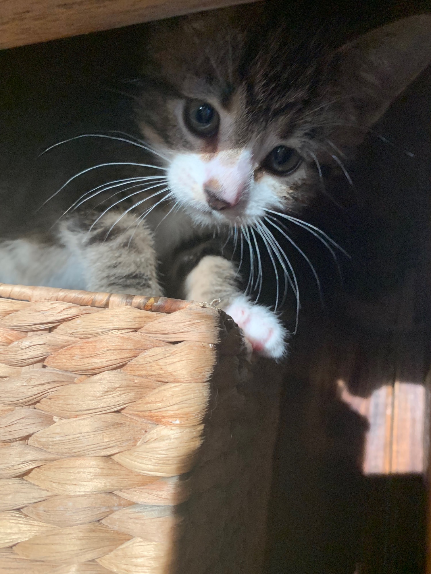 He is calm, relaxed, and happy to just watch the world around him. He loves food, and sleeping, and cuddling. He will purr as soon as you even go near him, that’s how much he loves his humans! He does love playing but he is definitely not a boisterous kitten at all.
