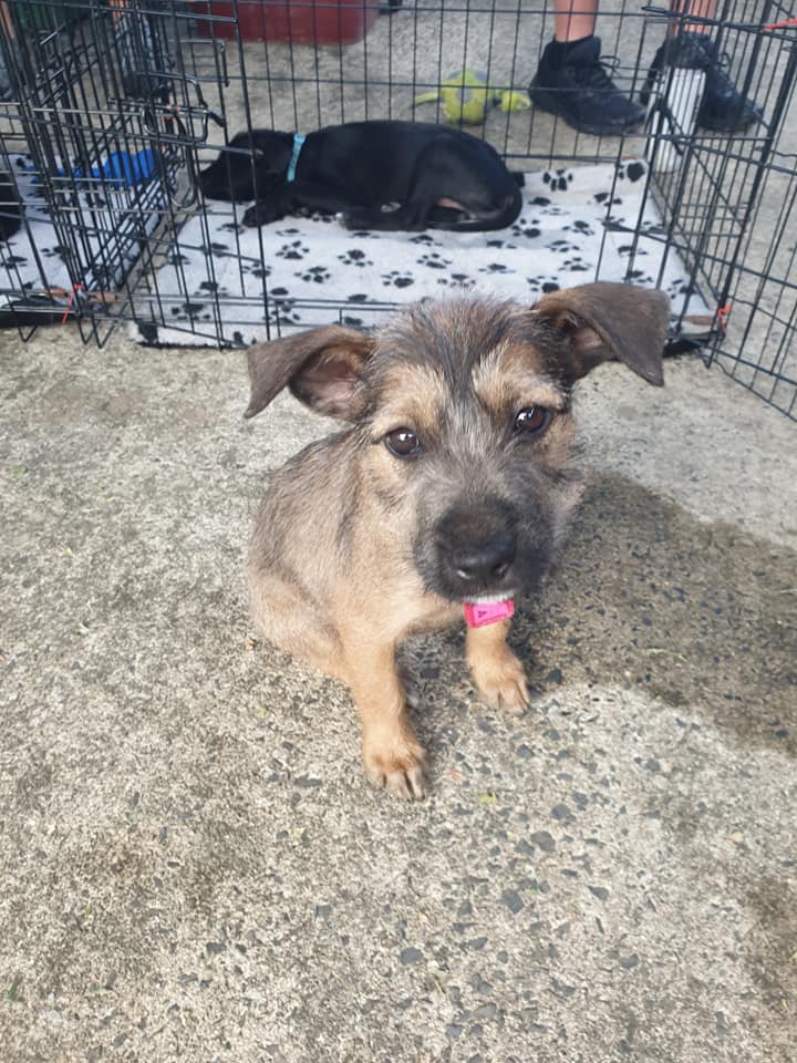Maeve is the scruffiest out of her siblings. She is a young lady with a beard. She is quiet happy to be in charge and can stand her ground with her brothers. Maeve likes to have a cuddle and is learning fast. She is happy to play games, she is learning how to chase toys but isn’t bringing them back yet. She is working hard on toilet training and will go outside the house when she is told to. Maeve is still teething and has his puppy teeth that are ready to chew on things.