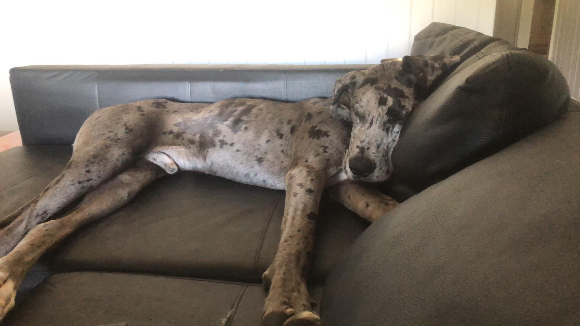 I was terrified at first but have come right out of my shell. I’m very friendly to everyone I meet. I have been out and about on lead and have met lots of other doggos and so far so good! I also get along great with my foster sister who is also a Great Dane. She gets a bit sick of me but she lets me play with all her toys. Speaking of toys, I LOVE TOYS. Mostly I love to wreck toys.. I’m at my most destructive at 6:30am until someone wakes up.