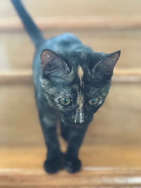 Minnie is a tiny gentle Tortoiseshell girl. She is very affectionate and loves to be held and cuddled. Minnie likes to hang out with her foster humans watching tv, cooking dinner and working in the office. She loves to play with her toys and poucen on her big brother Smokey. Minnie will tolerate small dogs and is fine with cats. She would fit in well to a home that can give her plenty of company and attention. She would be ok with families with children as she loves to be handled and Is very tolerant.