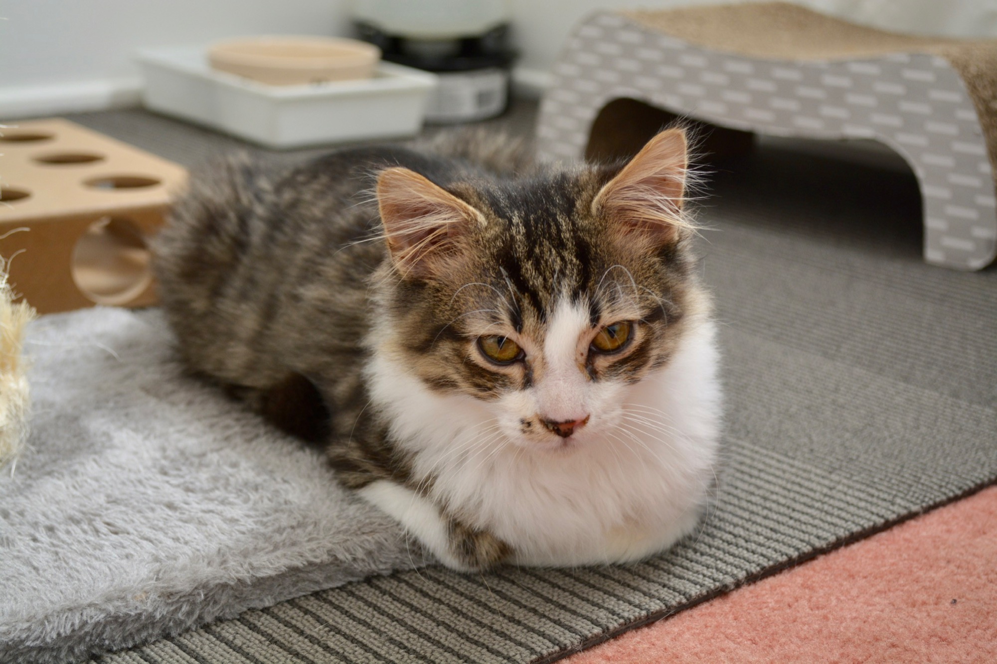 Majestic medium hair kitten Jack loves to settle on a warm lap and when he purrs, Jack sounds like a pigeon.